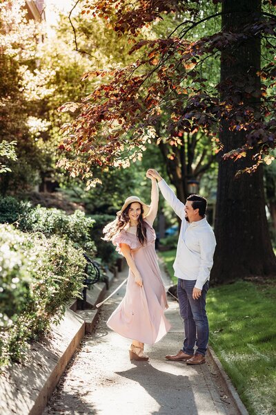 Generally couples pick two outfits for an engagement session: a more formal outfit and a casual outfit. I recommend saving your favorite outfit for later in the session, when couples usually feel more comfortable in front of the camera. And don’t forget to bring a few accesorries! Statement necklaces, cute shoes and classic watches are great ways to add detail to outfits.